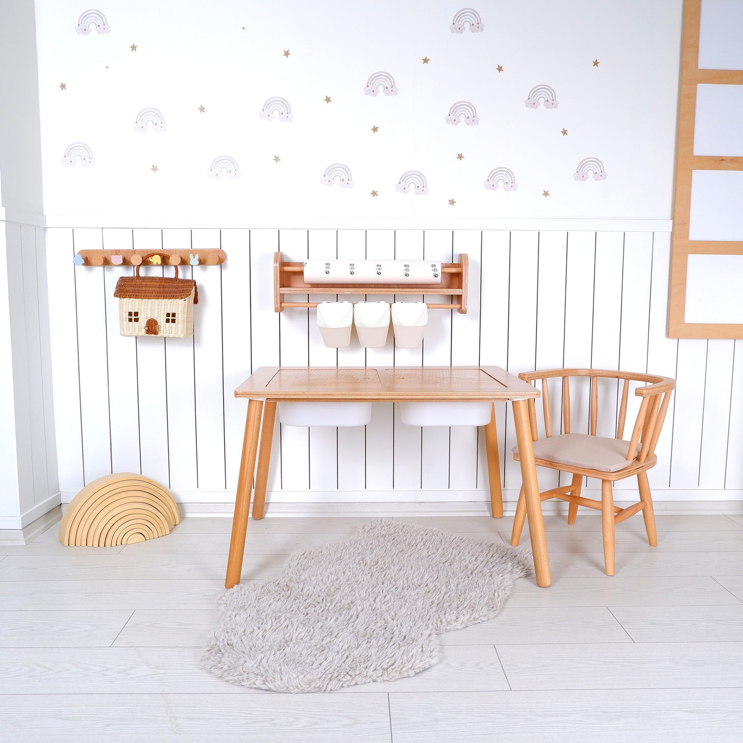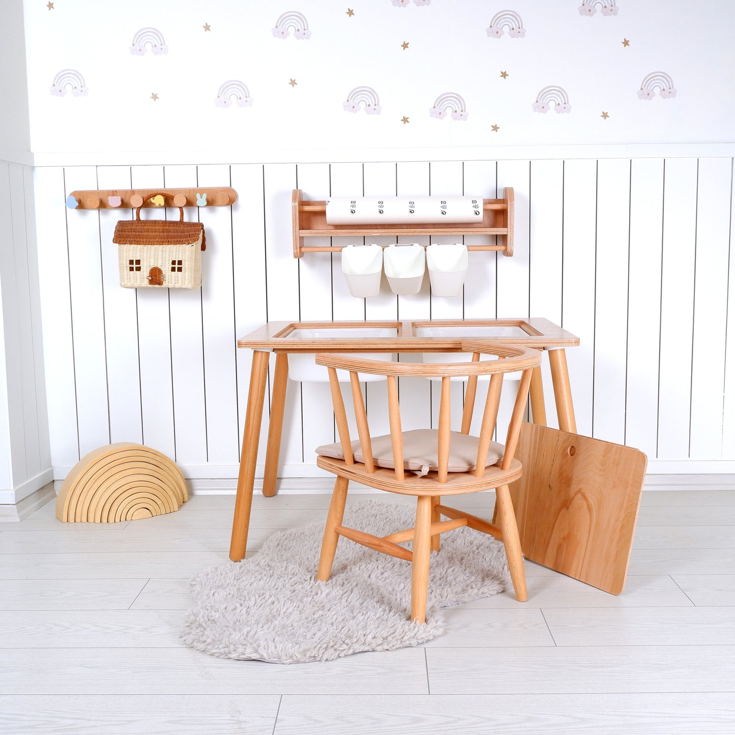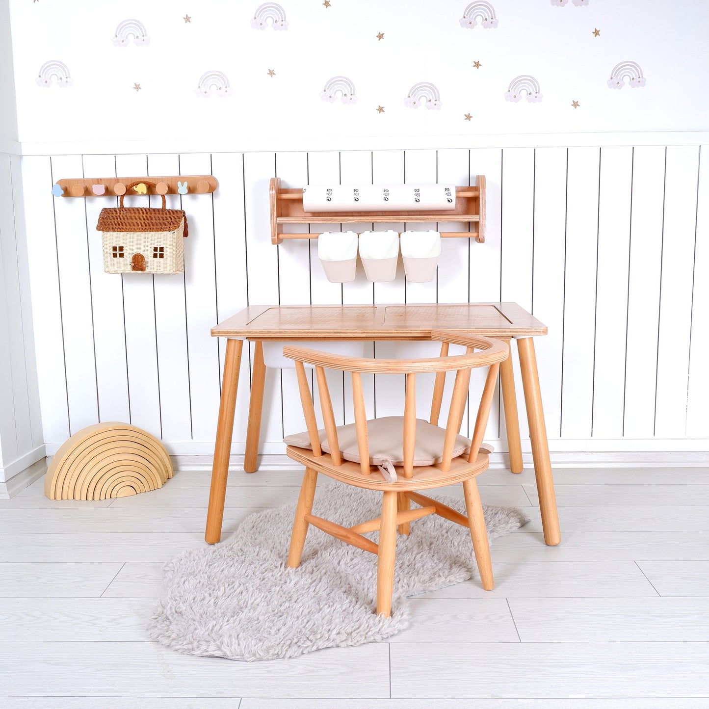 Add a touch of elegance to your child's room or play area with this Montessori-inspired wooden chair and table set. Our collection of eco-friendly wooden toys and kids' furniture offers high-quality and safe options for your little ones. Order now to bring a unique and charming element to your child's play space!