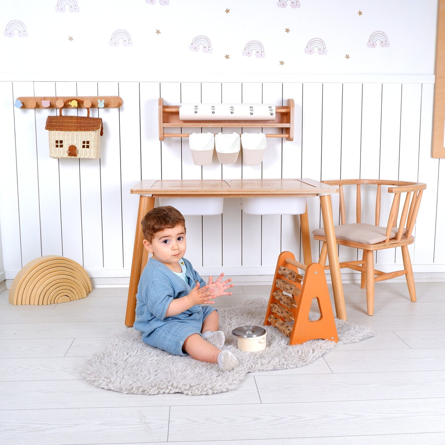 Add a touch of elegance to your child's room or play area with this Montessori-inspired wooden chair and table set. Our collection of eco-friendly wooden toys and kids' furniture offers high-quality and safe options for your little ones. Order now to bring a unique and charming element to your child's play space!