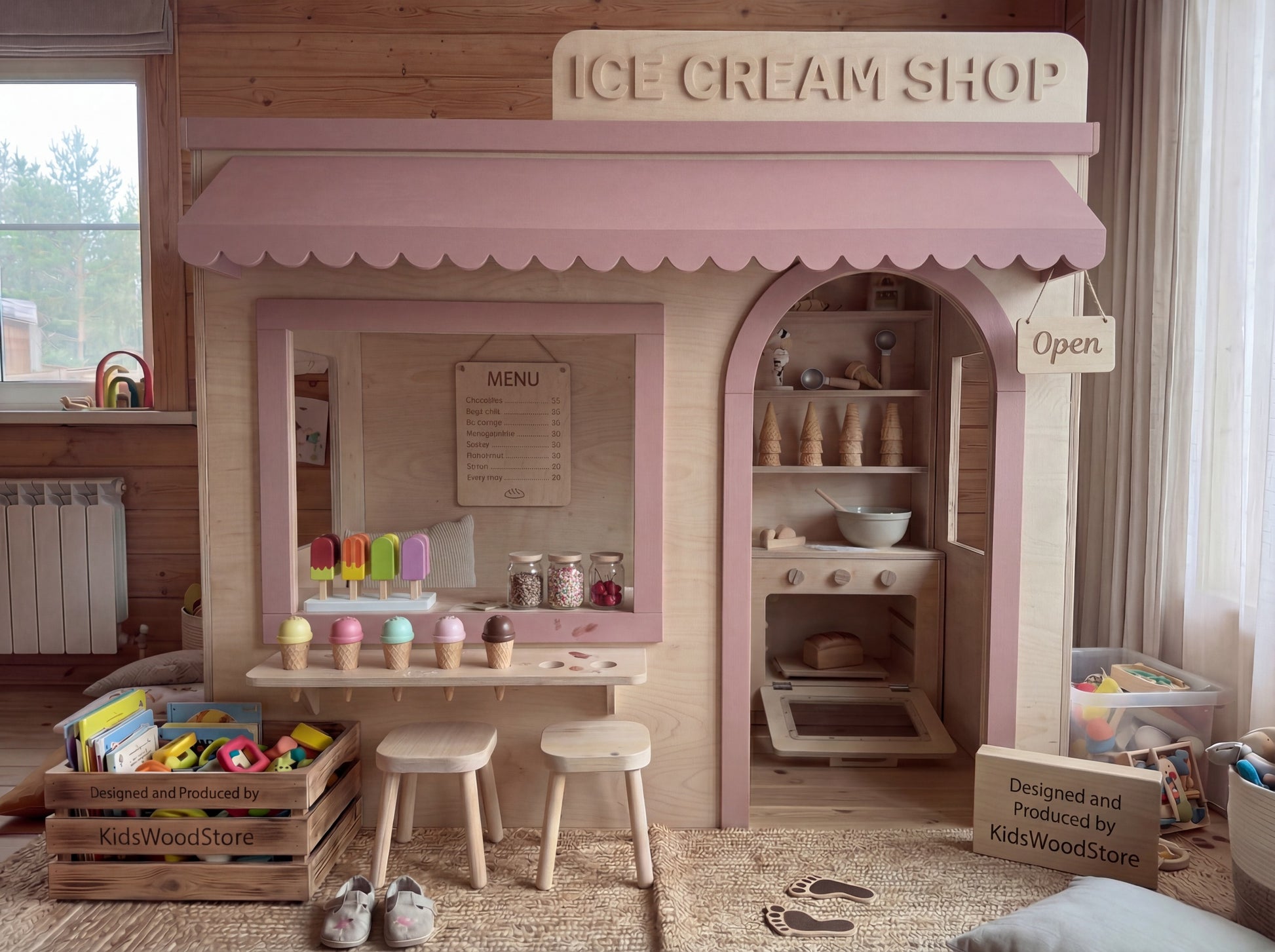 Wooden Kids Pretend Playhouse | Custom Indoor Role Play Ice Cream Shop Playhouse for Home & Commercial Use
