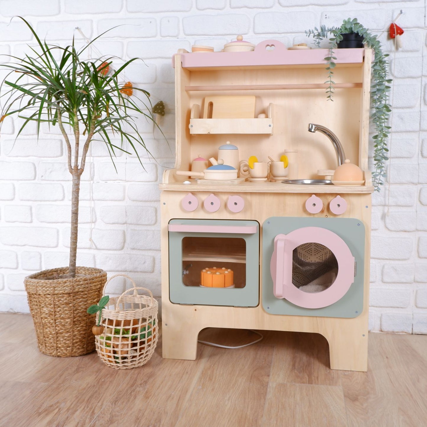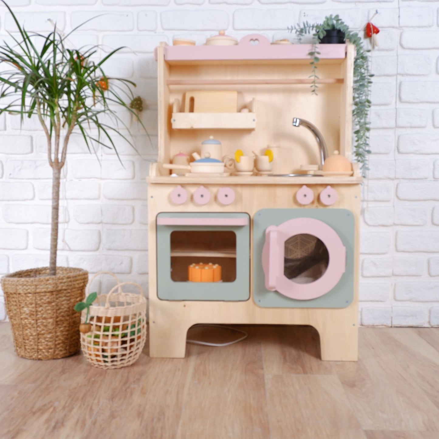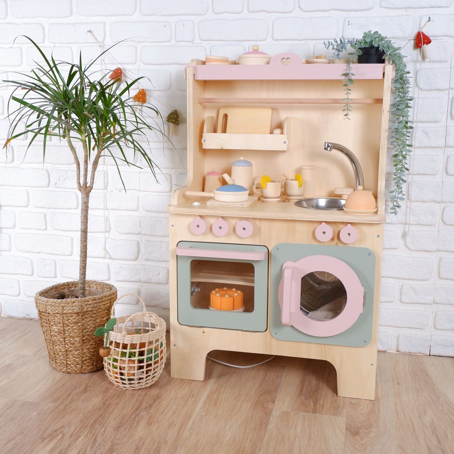Encourage your child's love for role-playing with this beautifully crafted kids play kitchen. Whether you are looking for a custom play kitchen to match your decor or a sturdy wooden kitchen set that will last for years, this set has it all. Perfect for toddlers and children, this pretend play kitchen is not only a wonderful wooden playset for kids but also a stylish piece of nursery furniture that fits seamlessly into any room