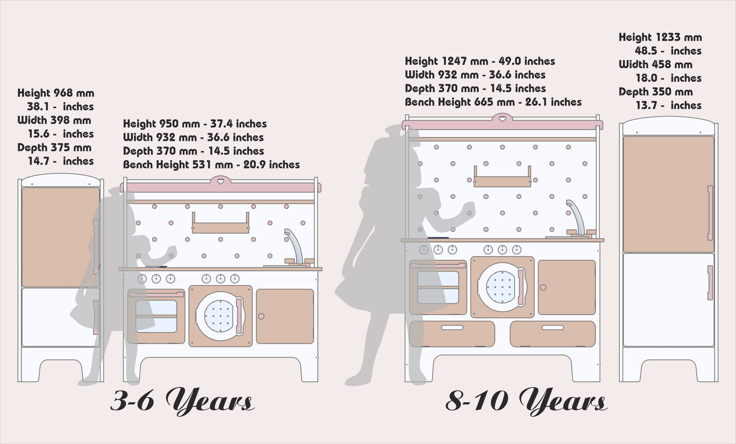 For 10 Years Old Biggest Wooden Play Kitchen has a counter height of 75 cm or 29.5 inches and additionally has two doors on the bottom. The refrigerator and other parts are also designed for 10 years older . Apron set is our gift for our customers who buy kitchen and toys for 10 years old.